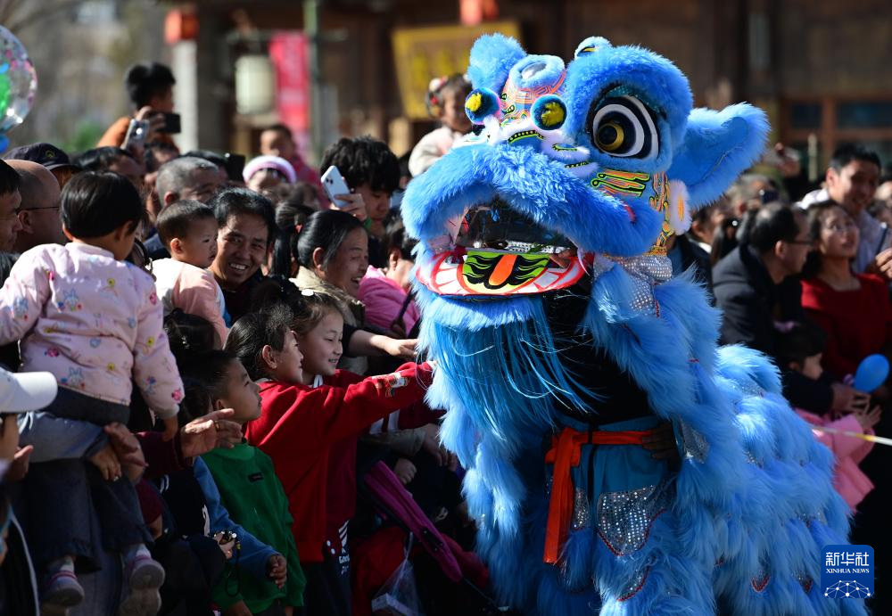2月20日,在陕西省延安市红街街区,舞狮演员与游客互动。