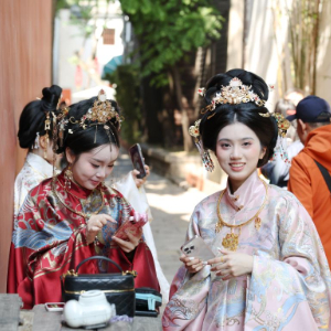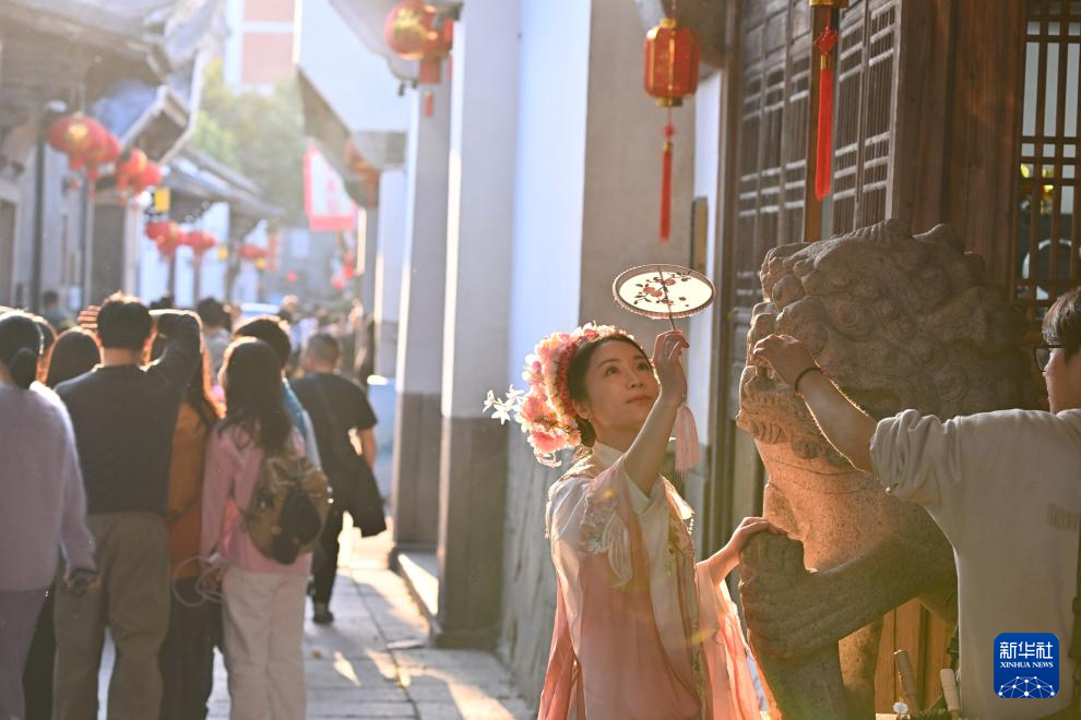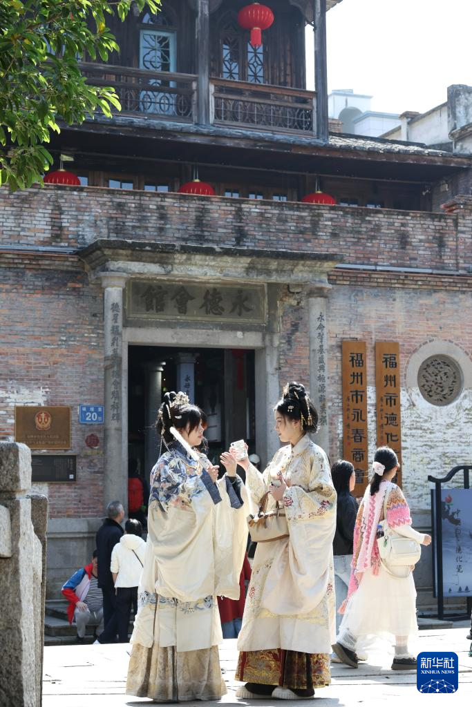 春节期间,福州上下杭、三坊七巷等传统街区洋溢着浓厚的节日氛围。街头巷尾,不少游客头戴簪花、三条簪等传统头饰,身着汉服、唐装等国风服装,或驻足拍照,或随队游玩;汉服巡游、国潮舞蹈快闪等节目轮番上演,为新春增添了一份别样的雅致与浪漫。
