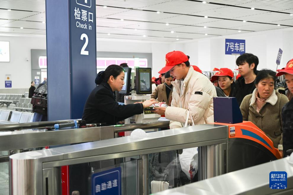 2月22日,来自黔东南州各区县的外出务工人员及家属在凯里南站检票进站。