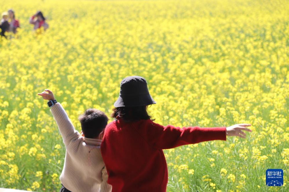 2月22日,在云南省文山壮族苗族自治州马关县夹寒箐镇上布高村,游人在油菜花海中感受春光。