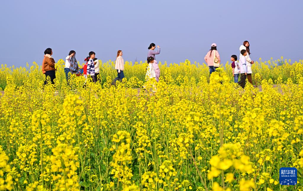 2月21日,游人在浙江省温岭市松门镇松建村欣赏绽放的油菜花。