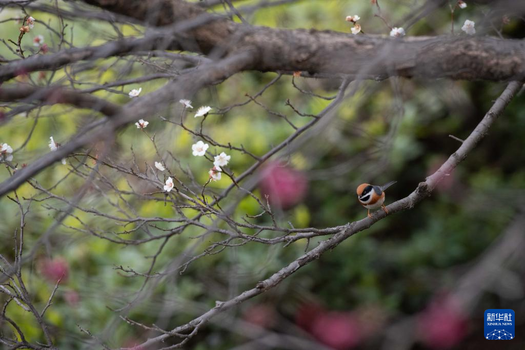 2月22日,合肥市匡河公园内梅花绽放,鸟儿在枝头小憩。
