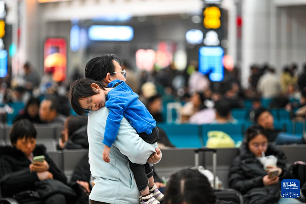 2月23日,一名小旅客和家人在河北石家庄火车站候车大厅候车。