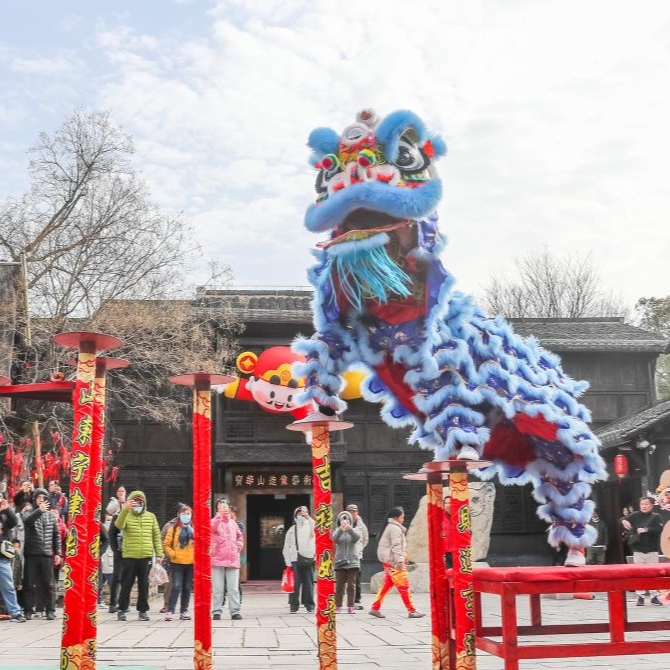 2月23日,游客在江苏省句容市宝华山国家森林公园观看舞狮表演。