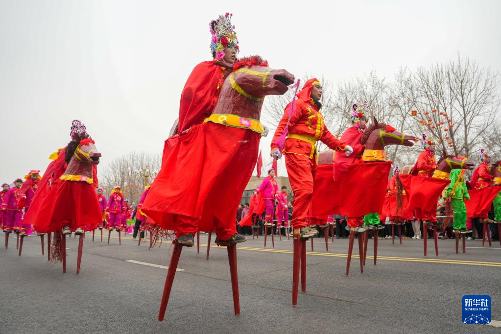 2月26日,民俗艺人在河北省灵寿县2026年新春民间艺术巡游展演活动中表演踩高跷(无人机照片)。