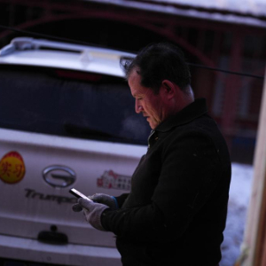 2月9日,在伊犁哈萨克自治州新源县,木沙江·海拉特在自家的院子里查看乡亲发来的电焊需求。