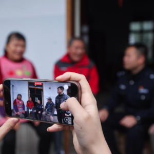 2月27日,赵家镇年轻基层干部拍摄派出所民警和村干部入户走访百姓、调解纠纷的视频。
