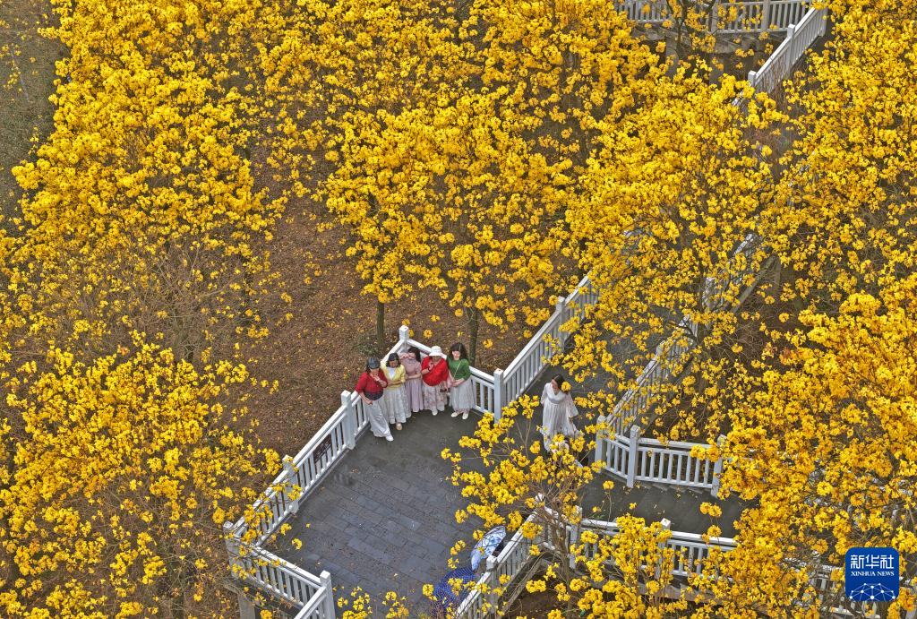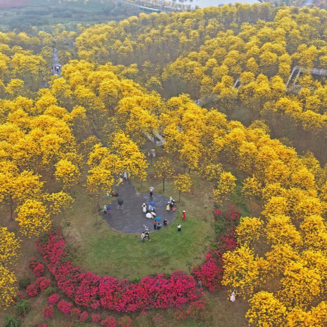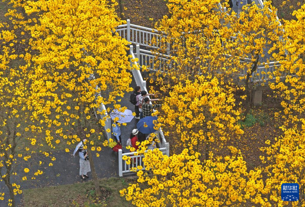 2月28日,游客在广西南宁市青秀山风景区观赏黄花风铃木(无人机照片)。
