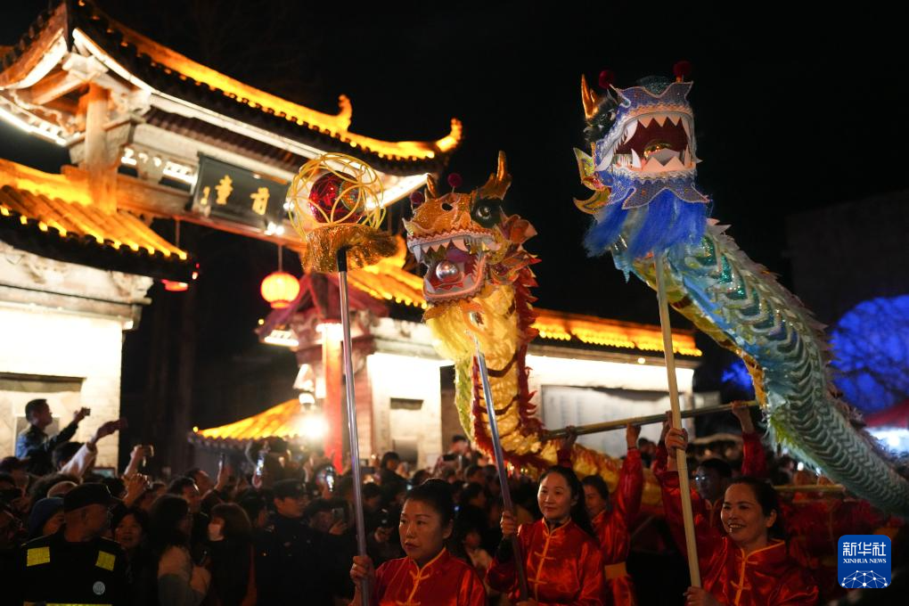 2月28日,舞龙队在浙江省湖州市德清县乾元镇第26届浙北乾龙灯会上巡游展演(无人机照片)。