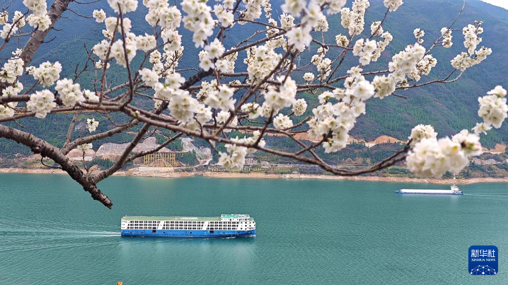 3月2日,船只航行在春花映衬下的重庆市巫山县长江巫峡水域。