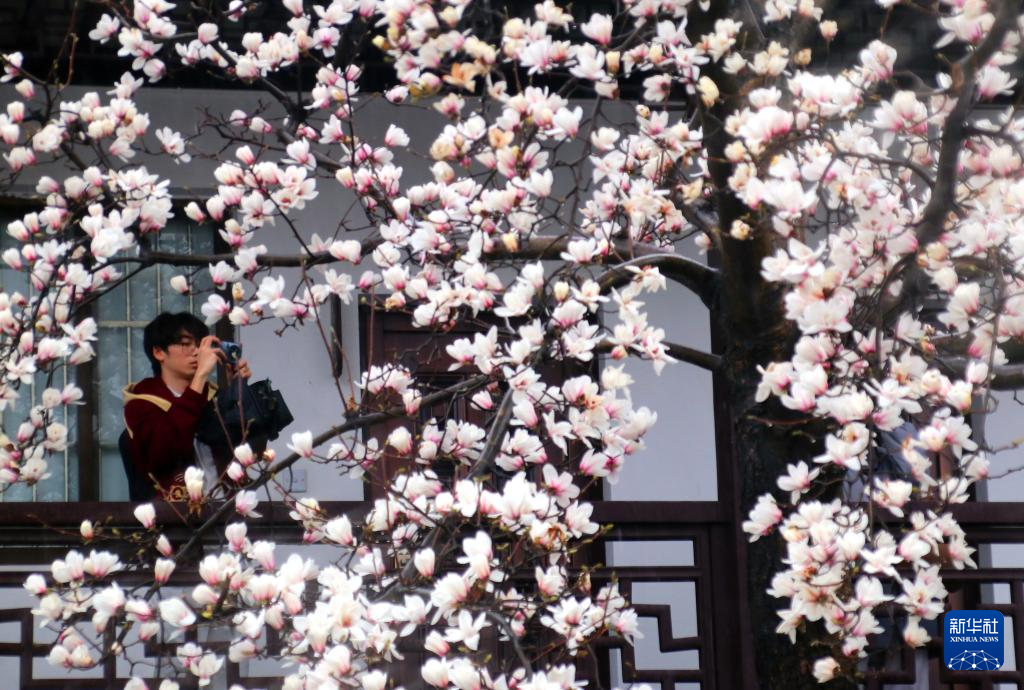 3月1日,游客在玉兰绽放的江苏省苏州市狮子林赏花游玩。