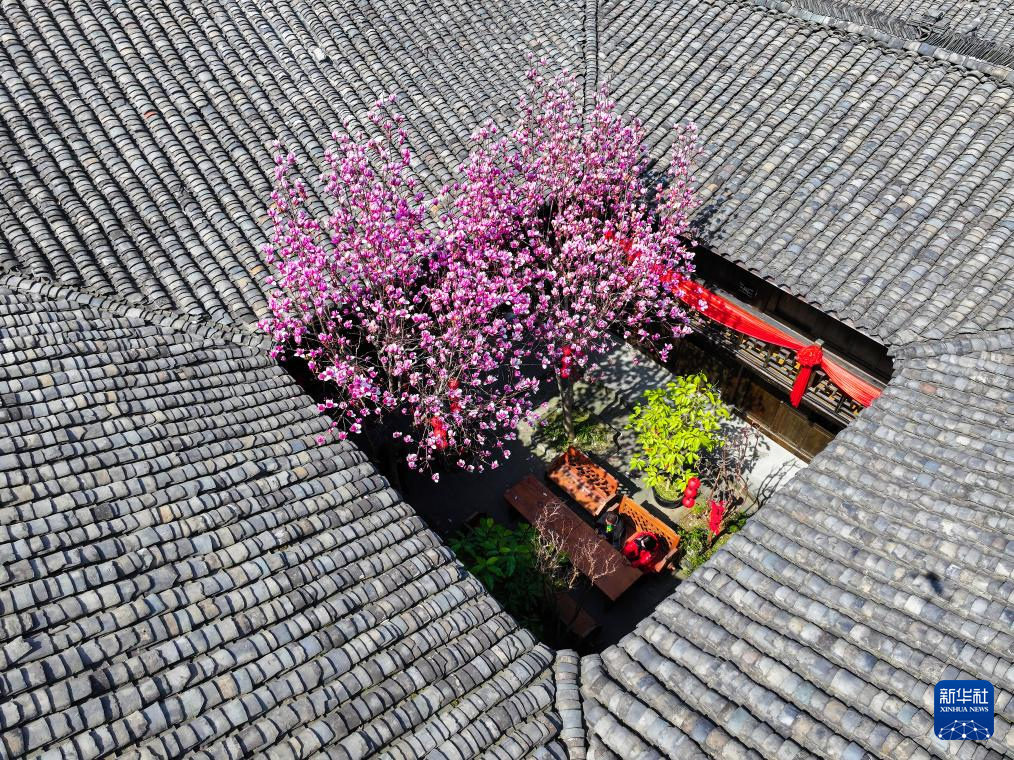 2月27日,人们在四川省阆中市阆中古城盛开的玉兰花下小憩(无人机照片)。