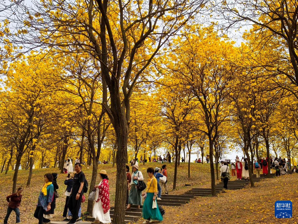 3月2日,人们在广西南宁市青秀山风景区观赏黄花风铃木。