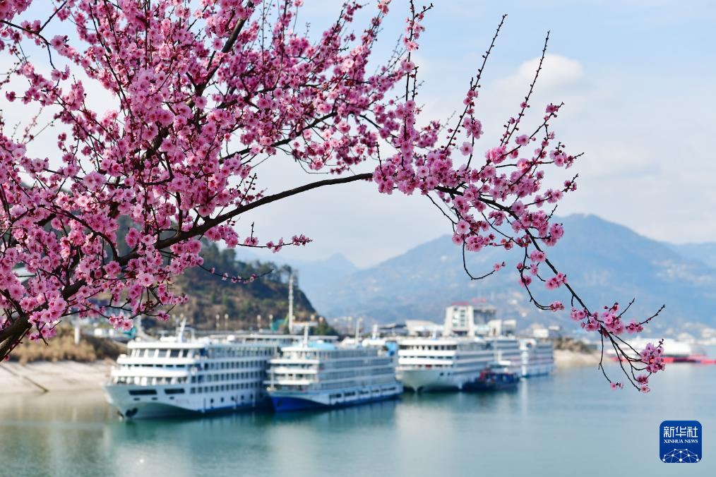 3月3日,客轮停靠在三峡大坝附近的湖北省宜昌市秭归县水域,岸边春花烂漫。