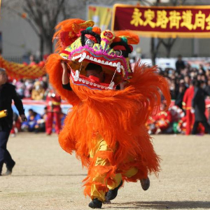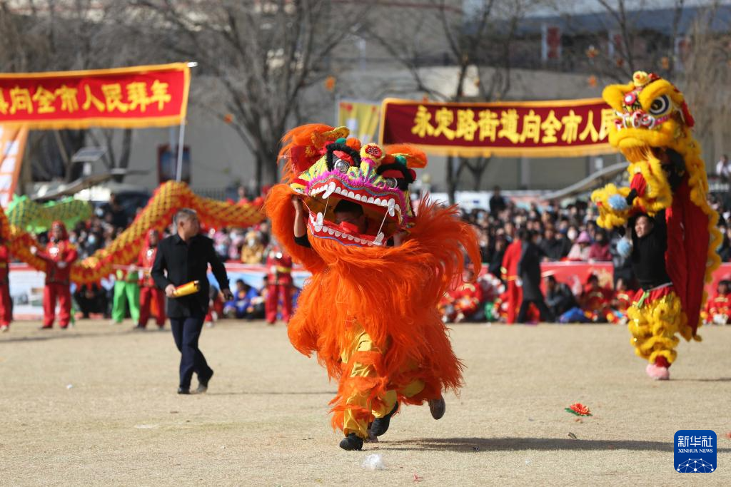3月3日,社火队员在甘肃省定西市安定区大操场表演舞狮。