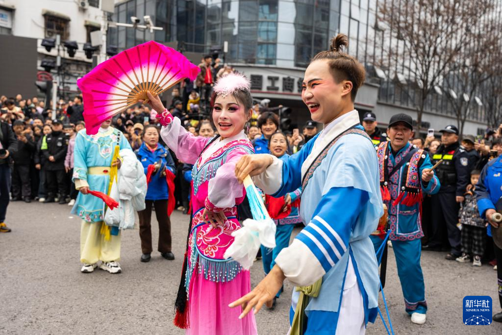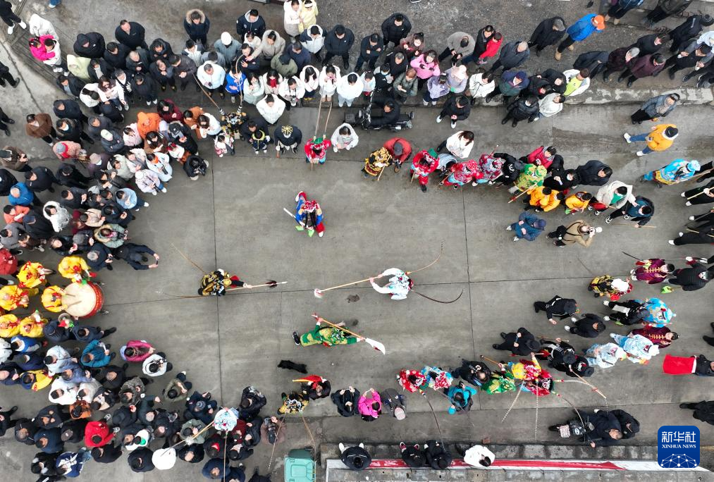 3月3日,民间艺人在湖北省咸宁市通城县银山广场表演。