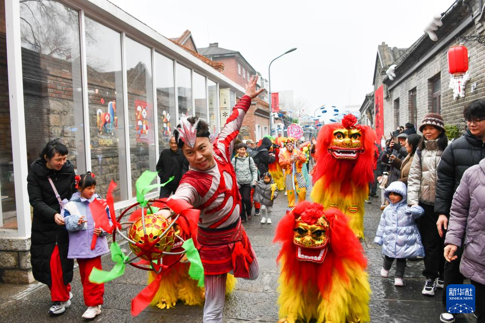 3月3日,济南市在上新街举行庆元宵演艺活动。这是人们在观看舞狮表演。