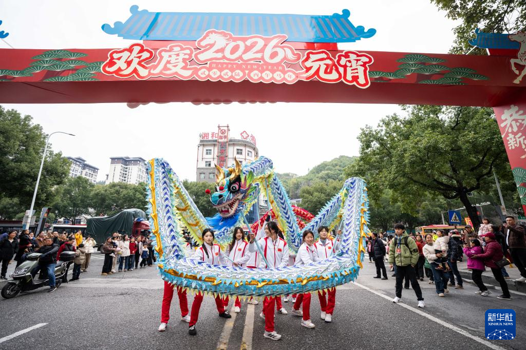 3月3日,以“仙境张家界·骏马踏春闹元宵”为主题的2026年张家界元宵灯会开幕。当地民间文艺队伍在张家界市永定区巡游演出。