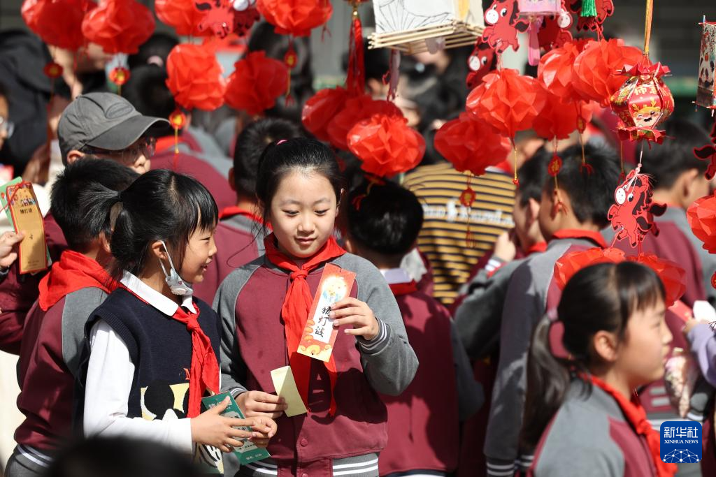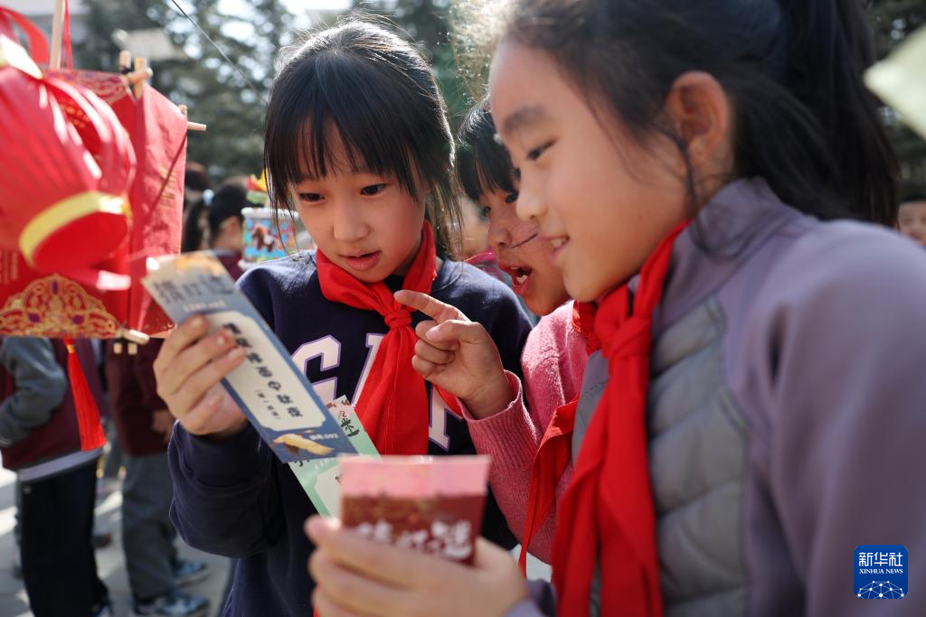3月3日,甘肃省兰州市东郊学校的学生在校园元宵节民俗活动上猜灯谜。