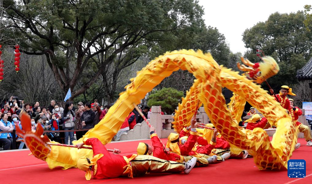 3月3日,游客在江苏苏州虎丘山景区观看舞龙。