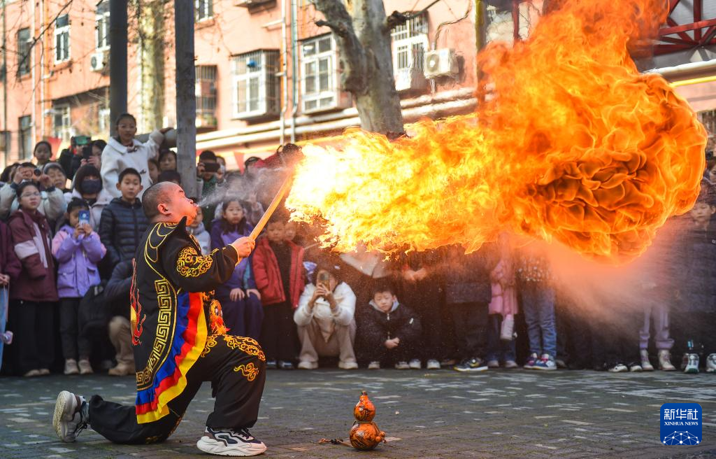 3月3日,人们在河南省洛阳市涧西区重庆路街道二社区举行的“元宵喜乐会”非遗市集传统文化体验活动中观看喷火表演。