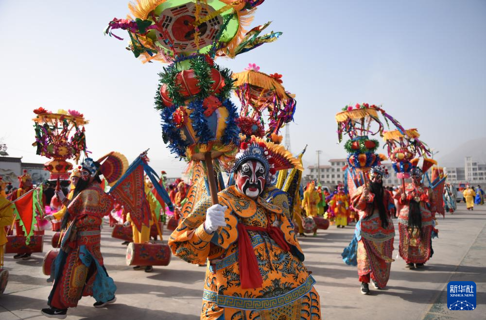 3月3日,社火队员在甘肃省临夏回族自治州永靖县太极镇大川村表演。