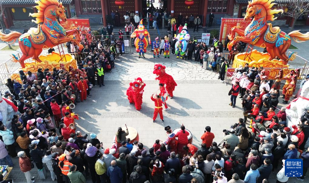 3月3日,游客在河南省许昌市灞陵桥景区观看舞狮表演(无人机照片)。