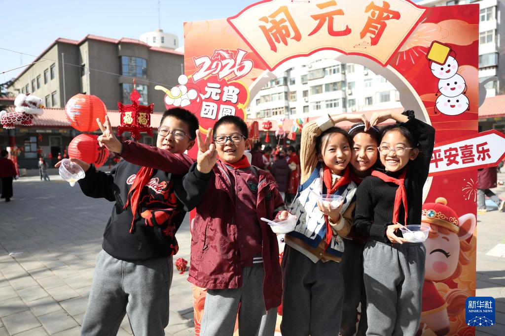 3月3日,甘肃省兰州市东郊学校的学生在校园元宵节民俗活动上合影留念。