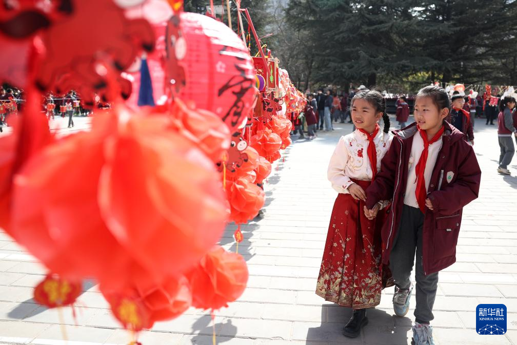 3月3日,甘肃省兰州市东郊学校的学生在校园元宵节民俗活动上观赏同学们制作的花灯。