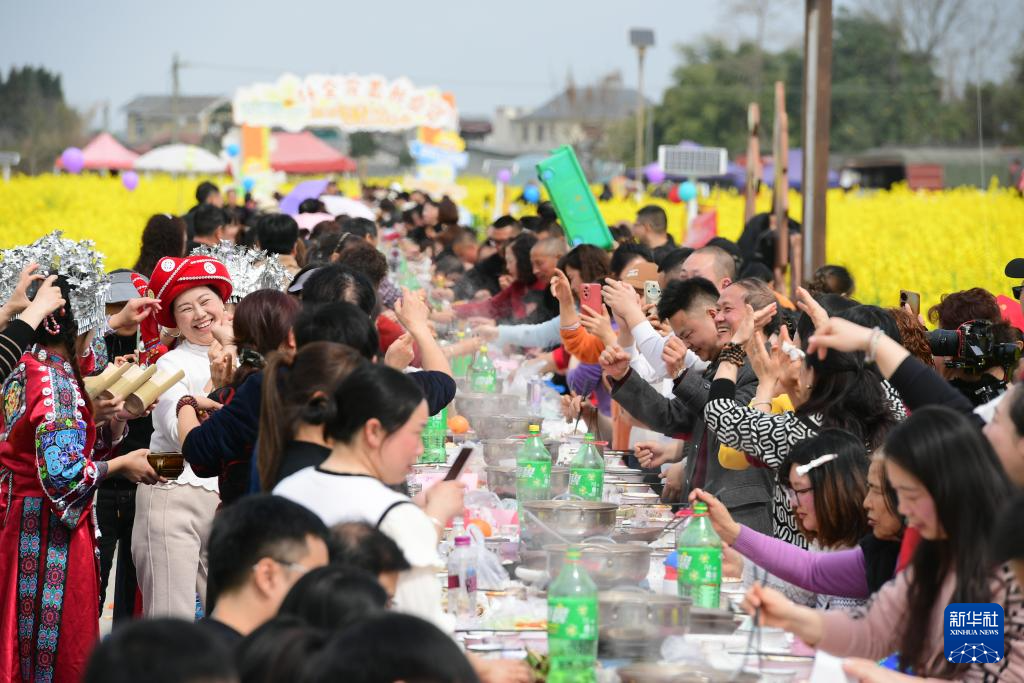3月3日,在四川省绵竹市什地镇五方村油菜花田,游人参加长桌火锅宴,欢度元宵佳节。
