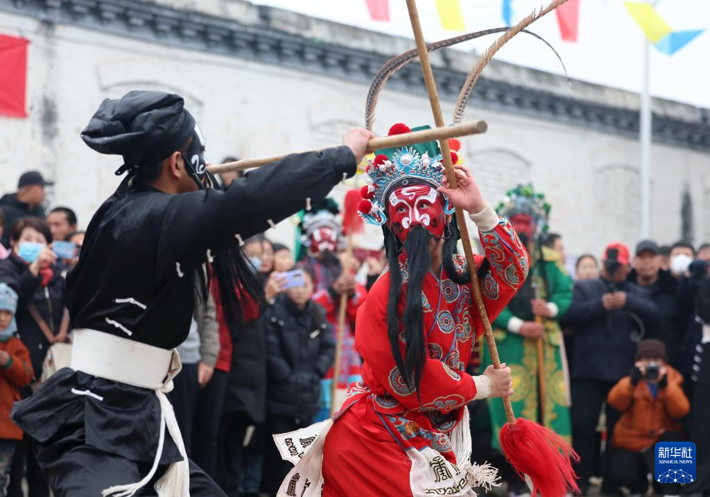 3月3日,民俗艺人在河北省井陉县小作镇桃林坪村为群众表演桃林坪花脸社火。