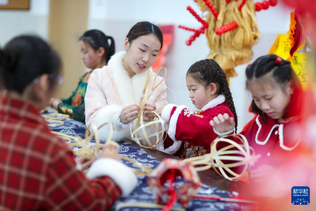 3月3日,在江苏省连云港市钟声和谐幼儿园,老师教小朋友制作元宵花灯。