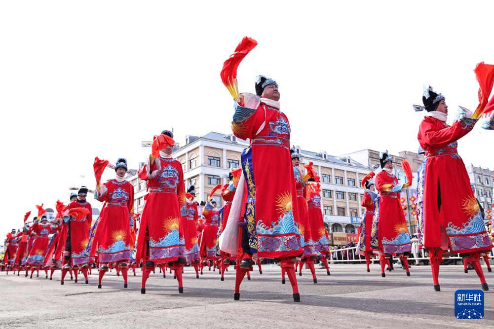 3月3日,秧歌队员在黑龙江省富锦市秧歌汇演现场表演。