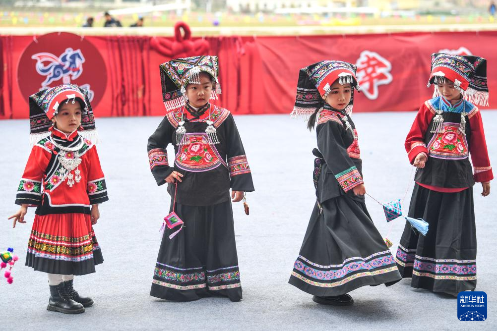 3月7日,孩子们在贵州省三都水族自治县“村马”比赛现场进行民族服饰展演。