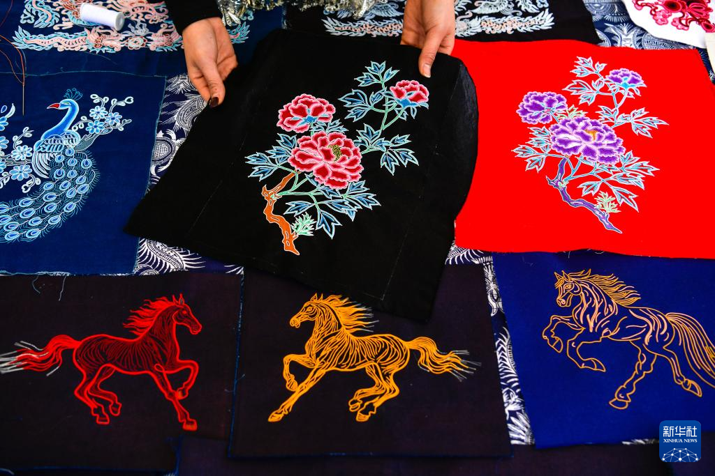 3月7日,绣娘在贵州省三都水族自治县“村马”比赛现场展示马尾绣。