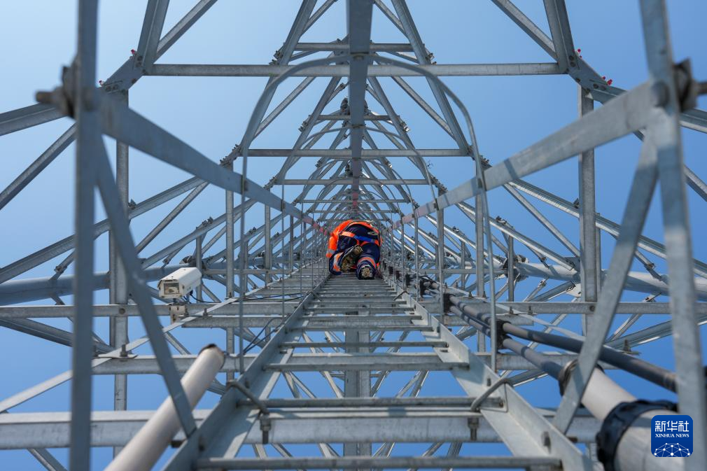 3月4日,在位于黑龙江省肇东市的哈齐高铁9号基站铁路通信铁塔上,铁路通信工佟泽龙向上攀爬。