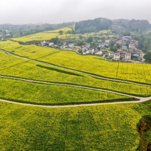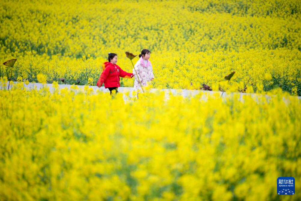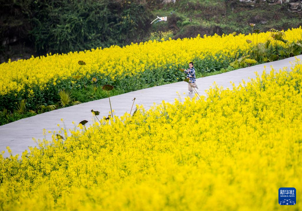 近日气温回暖,重庆市石柱土家族自治县黎场乡秀才村的千余亩油菜花进入盛花期,金黄色的花海将山村田园装扮成一幅美丽的春日画卷,吸引了游客前来踏青赏花,感受春天气息。