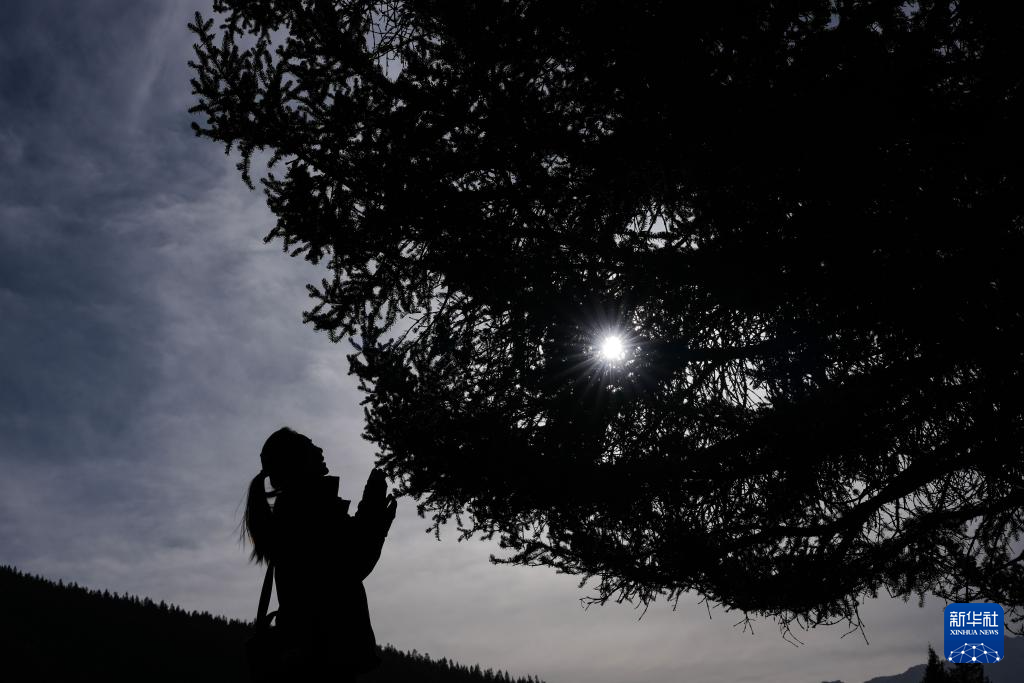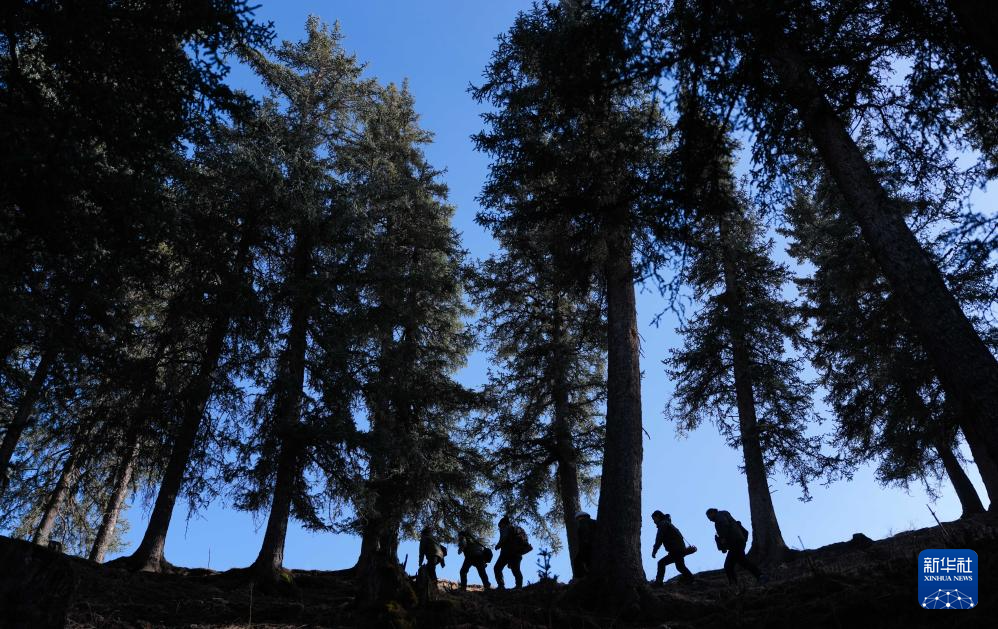 3月6日,祁连山国家公园(候选区)青海片区青阳沟管护站女子管护员张丽萍在查看林木生长情况。