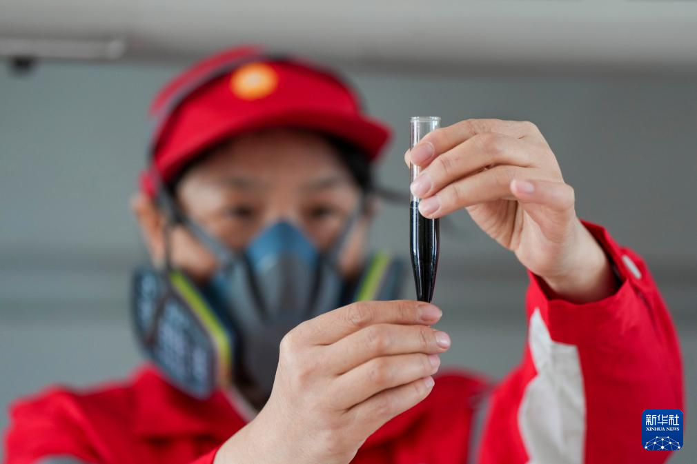 在大庆油田第六采油厂第六作业区,注采601班工人对石油进行取样(3月6日摄)。