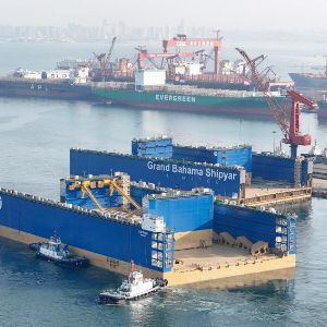 3月8日,由中船北海造船联合中船贸易建造的12万吨举力浮船坞“Lucayan”号首段顺利启运。该船坞配备先进自动坞控系统,融合智能压载、数字化冗余控制等技术,可实现安全高效、高精度的自动起浮与下沉操作,能够满足豪华邮轮的坞修及改装需求。