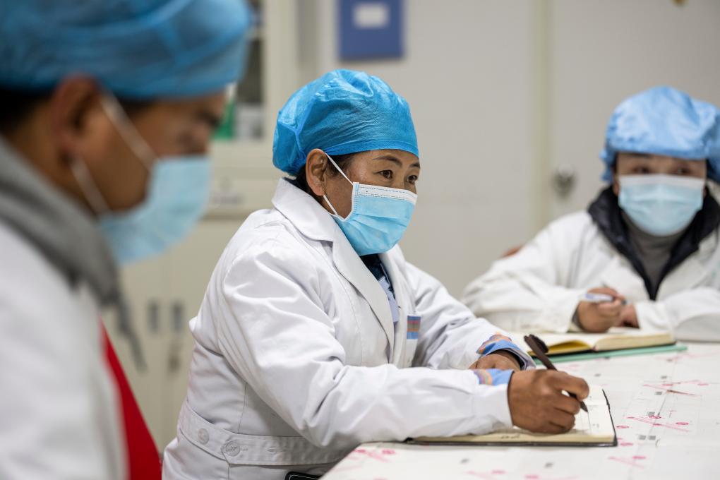 2月11日,在西藏拉萨,全国人大代表次仁措姆在西藏甘露藏医药产业集团有限公司生产车间调研。