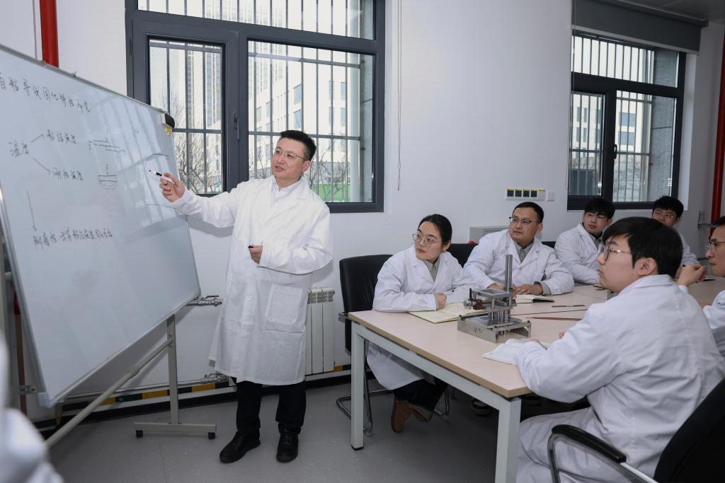 2月13日,在位于山东济南的山东电工电气设备公司工艺实验室,全国人大代表、中国电气装备集团副总经理张帆(左一)主持自粘导线固化特性实验方案讨论。