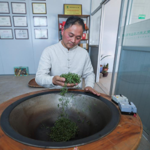 3月10日,金华市非物质文化遗产“武阳春雨制作技艺”代表性传承人、全国技术能手鲍王栋在炒制今年首批“武阳春雨”春茶。