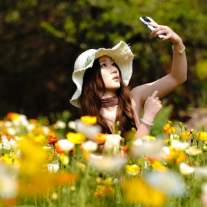 3月10日,两名游客在昆明名花谷拍照休闲。