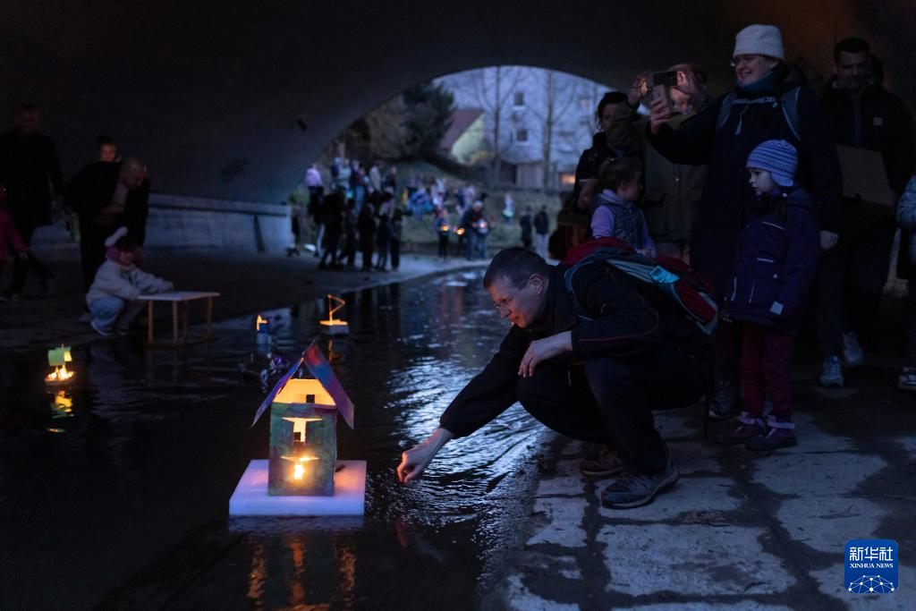 3月11日,在斯洛文尼亚卢布尔雅那,人们将自制的小船放在溪流中。