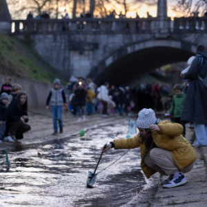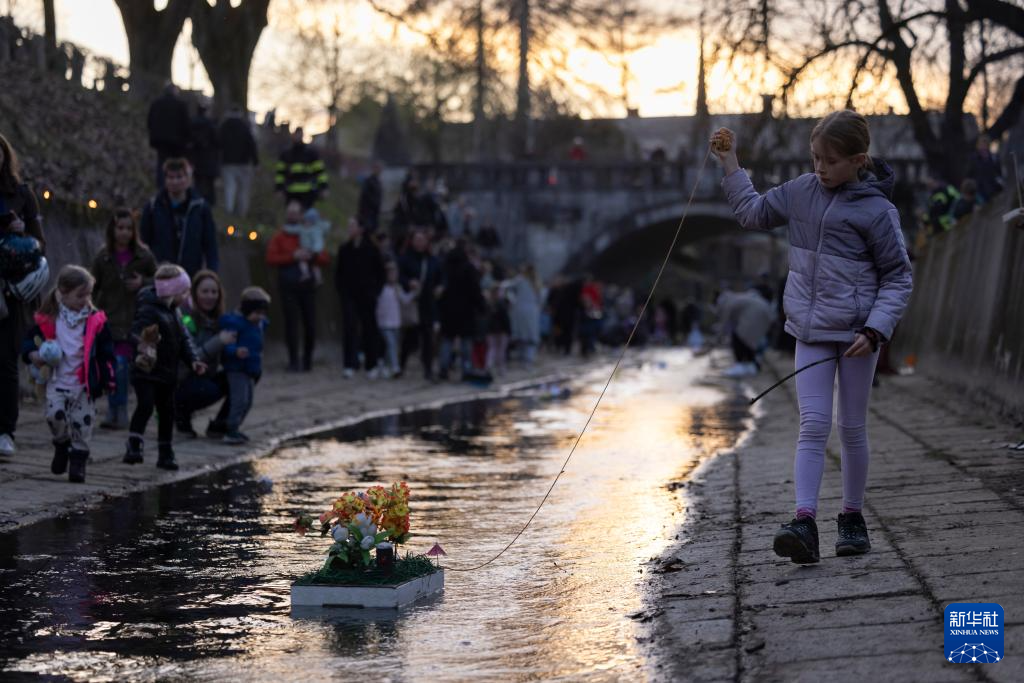 3月11日,在斯洛文尼亚卢布尔雅那,一名女孩将自制的小船放在溪流中。