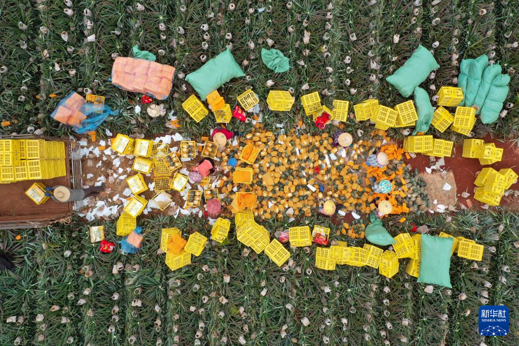 近日,海南省海口市琼山区大坡镇的金钻凤梨种植基地迎来集中采收期,当地农户抢抓农时采摘凤梨。