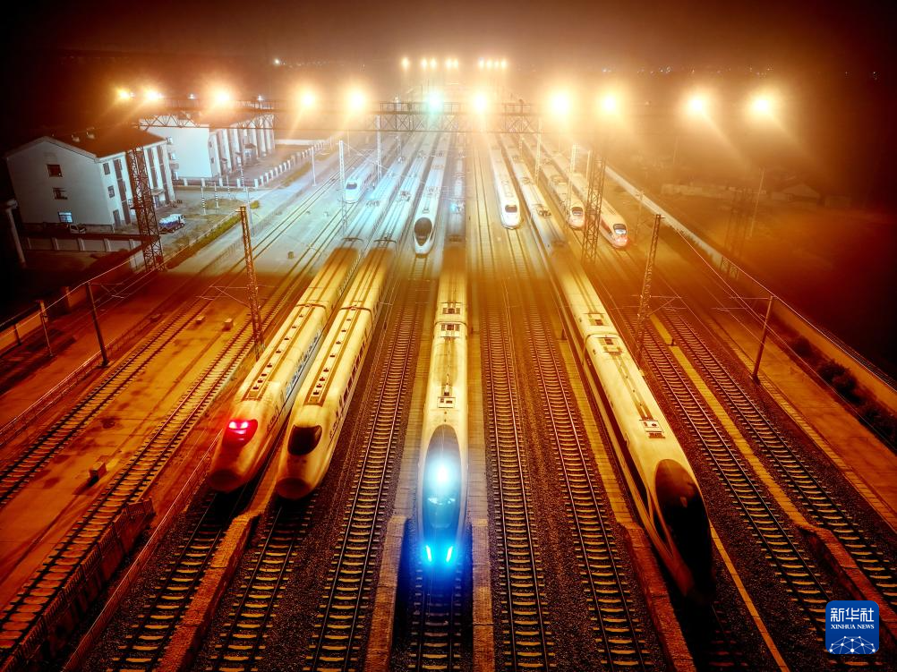 3月13日,动车组列车在江苏省连云港站等待发车(无人机照片)。