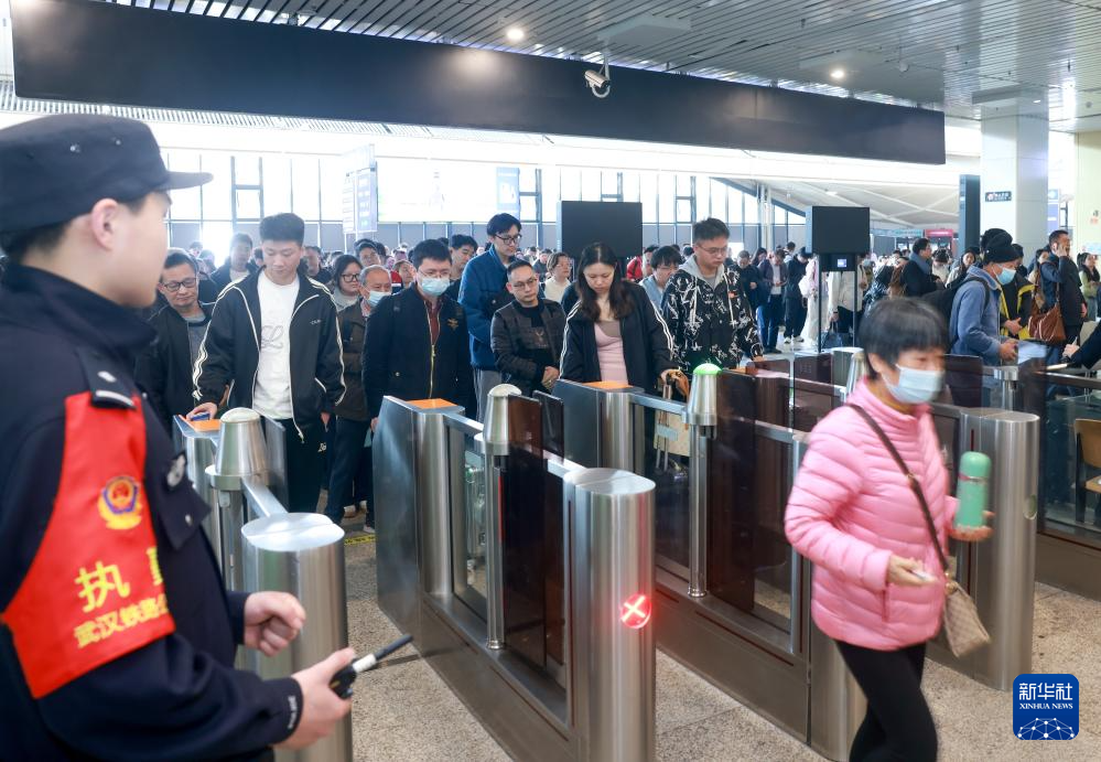 3月13日,旅客在湖北武汉站通过自助检票闸机有序进站乘车。