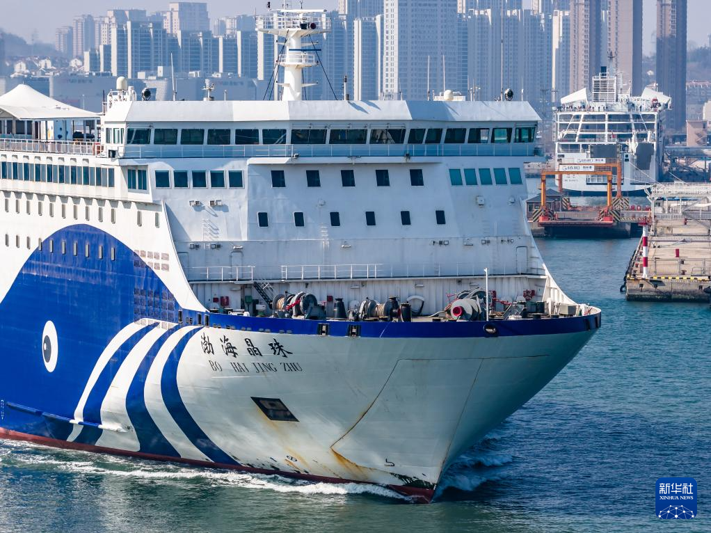 3月13日,客滚船从山东港口烟台港驶出(无人机照片)。